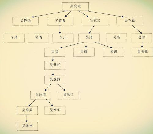 (按):据《明史》、《明实录》等史志载:凉州吴氏家族八世子孙,凡32人。公、侯、伯三等爵位中,封赠国公有二(邠国公、凉国公);袭封侯爵有八(恭顺侯);袭封伯爵有六(恭顺伯二、广义伯三、赠遵化伯一);加升太子太保一,太子少保一。考其爵位延续到明朝末年的只有恭顺侯(吴允诚)、清平伯(吴成)、南宁伯(毛胜)、东宁伯(焦礼)、怀柔伯(施聚)、伏羌伯(毛忠)、武平伯(陈友)7家,而活到明朝末年的贵族一共有67名(不含南明册封的)。恕不一一。由上可知,凉州吴氏家族在明清时期,堪称首屈一指的勋臣世家;又是皇亲国戚。这在凉州世家大族中,还是很罕见的。其封爵世系,详见下表:第一代:吴允诚,永乐十年(1412年)封恭顺伯,予世券。永乐十五年(1417年)去世,谥号“忠壮”。第二代:吴克忠,吴允诚之子,永乐十六年(1418年)袭爵。第一代:吴克忠,洪熙元年(1425年)自恭顺伯进封恭顺侯,予侯爵世券。正统十四年(1449年)死于土木之变,追封邠国公,谥号“忠勇”。第二代:吴瑾,吴克忠之子,正统十四年(1449年)袭爵。天顺五年(1461年)死于曹钦之乱,追封凉国公,谥号“忠壮”。第三代:吴鑑,吴瑾之子,天顺六年(1462年)袭爵。正德元年(1506年)十二月去世。第四代:吴世兴,吴鉴之子,正德二年(1507年)袭爵。嘉靖十七年(1538年)去世 。第五代:吴继爵,吴世兴之子,嘉靖二十七年(1548年)袭爵。万历二十七年(1599年)去世。第六代:吴汝胤,吴继爵之子,万历二十七年(1599年)袭爵。崇祯四年(1631年)去世。第七代:吴惟业,吴汝胤之子,崇祯四年(1631年)袭爵。卒年不详。吴惟英,吴惟业之弟,袭年无考。崇祯十六年(1643年)十二月去世。第一代:吴克勤,允诚四男,自立军功,升左都督。土木阵亡,赠遵化伯。第二代:吴琮,克勤子,以从兄吴玘卒无嗣,袭广义伯爵。回镇守,失机革爵。(按):以上世系参考《古穰集•卷十•恭顺侯追封凉国公谥忠壮吴公神道碑铭》、《明史纪事本末•卷三十六•曹石之变》、《明史•卷一百六•表第七》、《明史•卷一百五十六•列传第四十四》。(注):太子太保,太子少保都是东宫官职,均负责教习太子,是保护太子安全的,统称为“三师”。二者的取别:一是职级不同。少保是太保的副职。二是品级不同。太子太保是从一品官,太子少保为正二品。