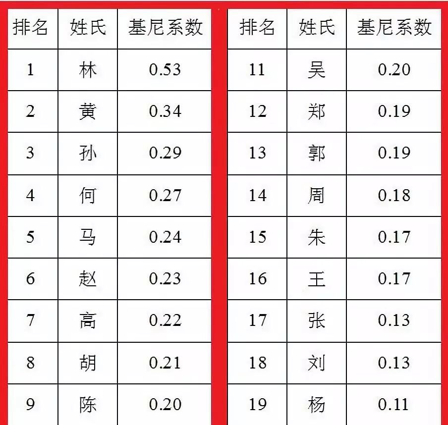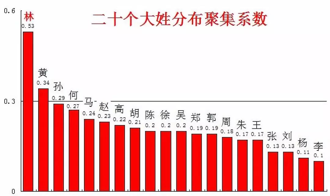 中国人民大学人口与发展研究中心借助全国公民身份证号码查询中心数据研究表明,在人口排名前20的大姓中,绝大多数姓氏的基尼系数(聚集系数)都在0.10-0.34范围内,但有一个姓很特殊,其基尼系数高达0.53,这个姓氏就是 “林”。(见下图和表)
