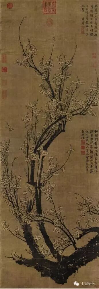 “吾家洗砚池头树,个个花开淡墨痕。不要人夸好颜色,只留清气满乾坤。”这首著名的咏梅诗为元代画家王冕自题“墨梅图”上。王冕学画的故事曾写在小学的语文课本上,为众人熟知。清代朱方蔼曾说:“宋人画梅,大都疏枝浅蕊。至元煮石山农(王冕)始易以繁花,千丛万簇,倍觉风神绰约,珠胎隐现,为此花别开生面。”这一幅“墨梅图”即是繁花的代表作。此图作倒挂梅。枝条茂密,前后错落。枝头缀满繁密的梅花,或含苞欲放,或绽瓣盛开,或残英点点。正侧偃仰,千姿百态,犹如万斛玉珠撒落在银枝上。白洁的花朵与铁骨铮铮的干枝相映照,清气袭人,深得梅花清韵。干枝描绘得如弯弓秋月,挺劲有力。梅花的分布富有韵律感。长枝处疏,短枝处密,交枝处尤其花蕊累累。勾瓣点蕊简洁洒脱。王冕墨梅出于北宋扬无咎派。但宋人画梅大都疏枝浅蕊。此幅则写繁花密枝,别开生面。