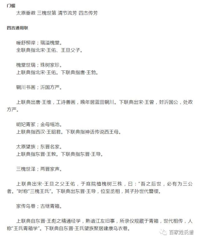 上联典自王佑、王导、王安石、王阳明、王夫之等,比喻王氏家族礼义传家,诗书教子,人才济济,尤善整章建制;下联典自轩辕黄帝、王羲之、王献之等,说明王氏家族乃帝王之苗裔,源远流长。