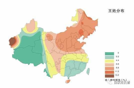 全国形成了以长江为界的高比率的北方王姓区和低比率的南方王姓区。而北方区又以太行山为分水岭,东部为高密度的王姓地区。西部为低密度的王姓区。王姓分布很广,但很不均衡。